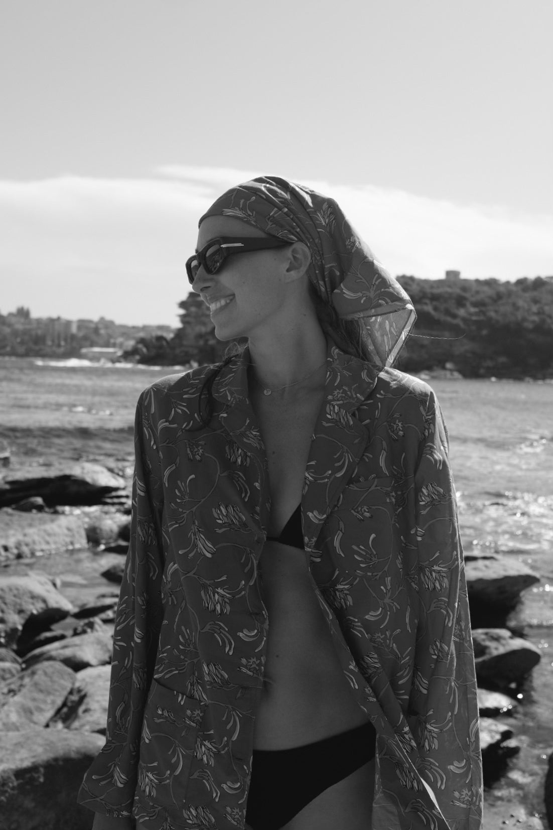 An oversized long sleeve button down pajama style shirt with three front pockets. Four button closures. Lightweight. 35% Silk, 65% Cotton. Hand wash cold. Designed and made in New York, USA.
